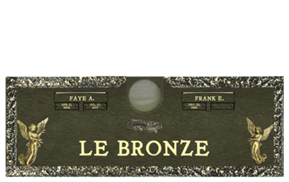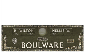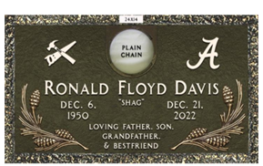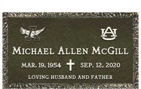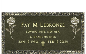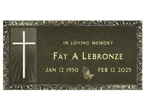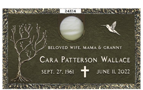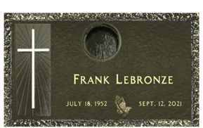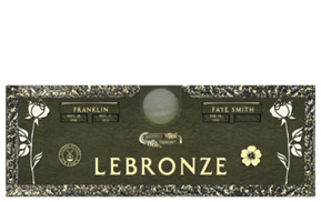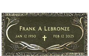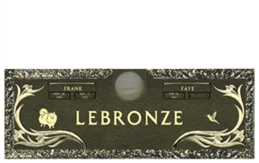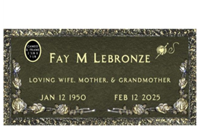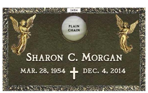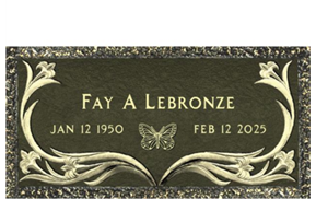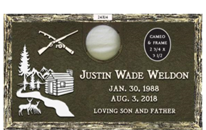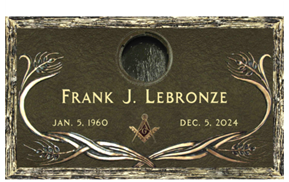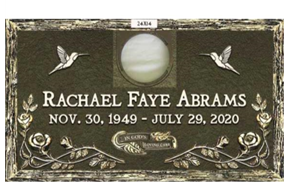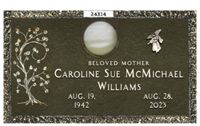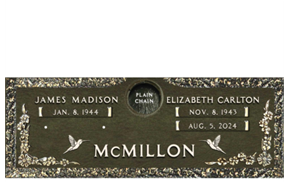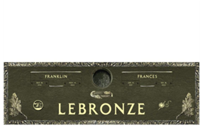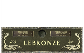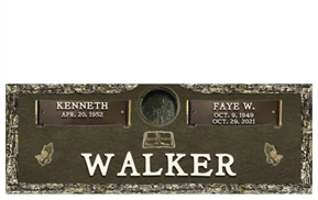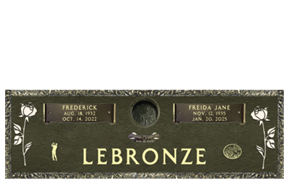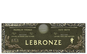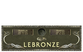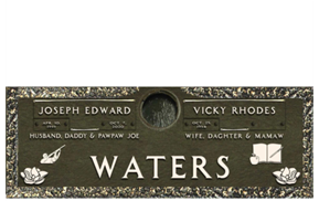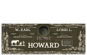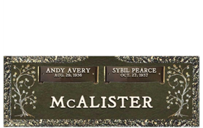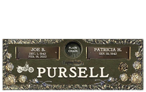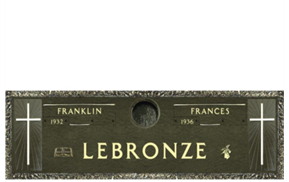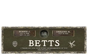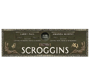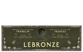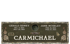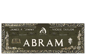 Up to 8 words either put together as an epitaph at the bottom or 4 words placed under the scrolls for each person and a maximum of 3 emblems.
